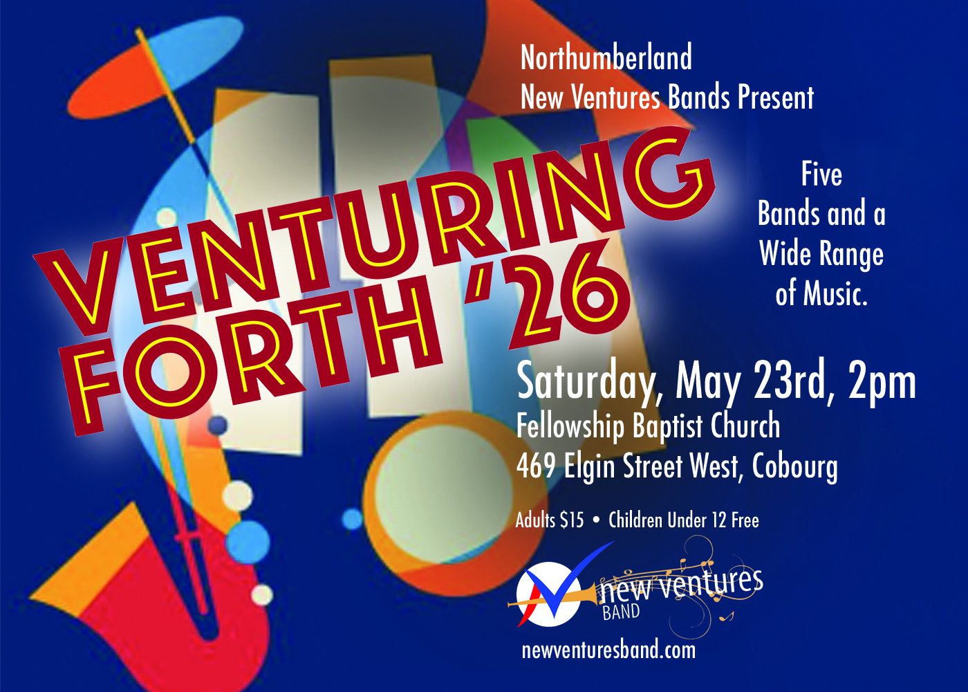 Don’t miss our first full concert of 2026 featuring all New Ventures Bands. With five bands featured, there will be a wide range of music from classic to contemporary! This concert will be at Fellowship Baptist Church, 469 Elgin Street West, Cobourg. Doors open at 1:30.